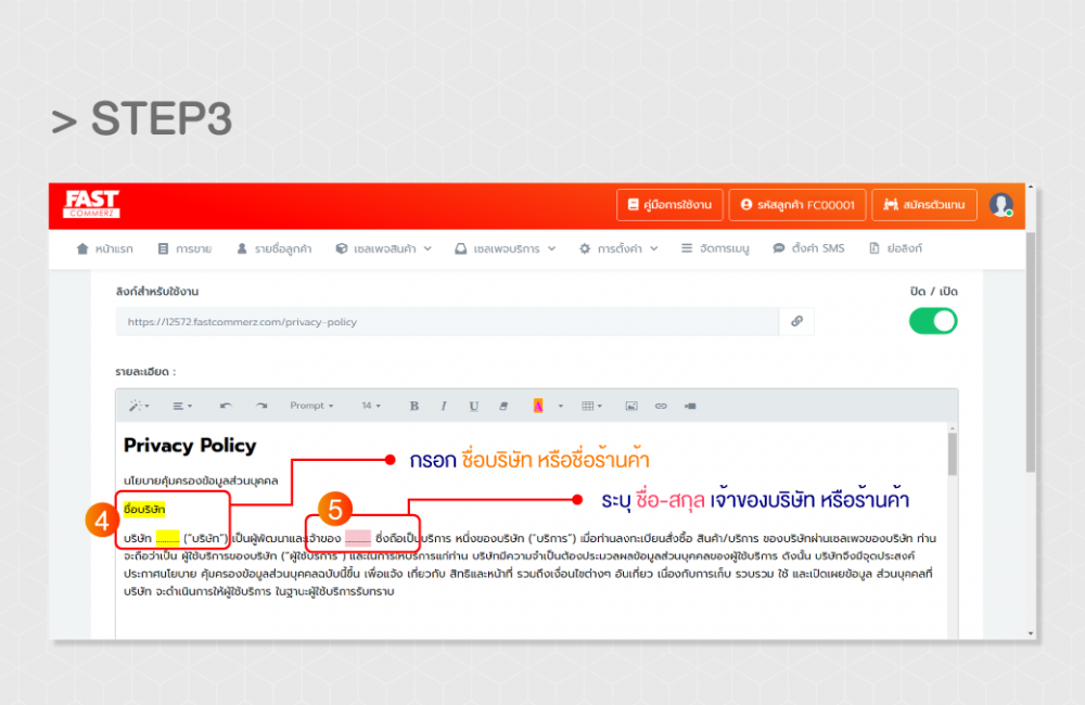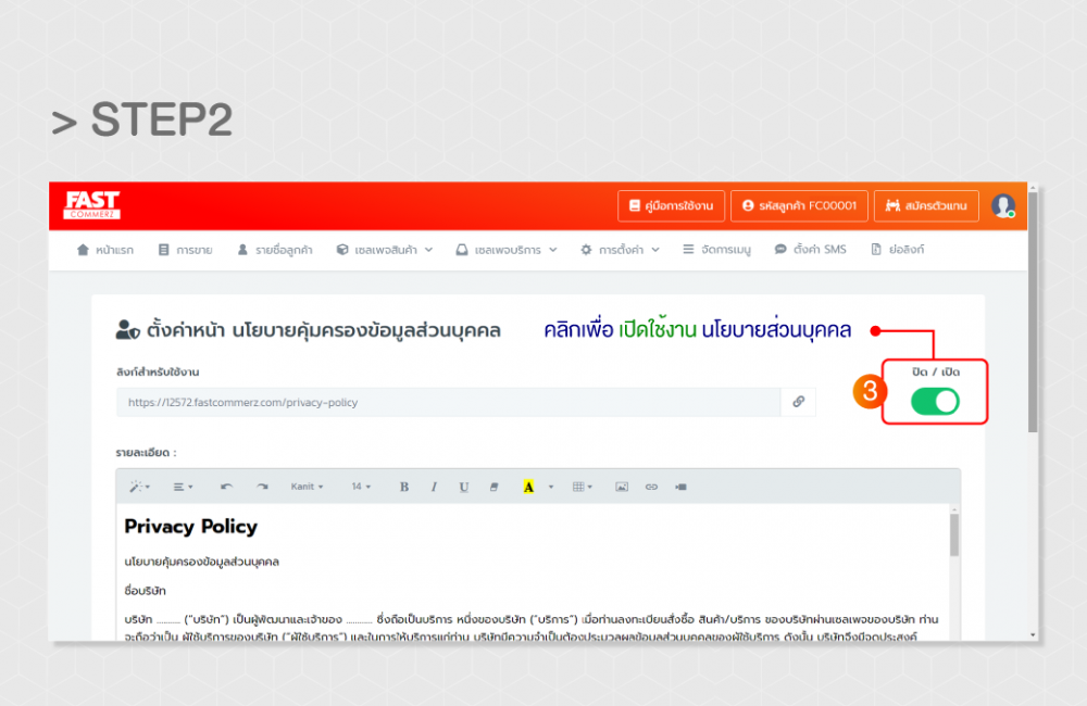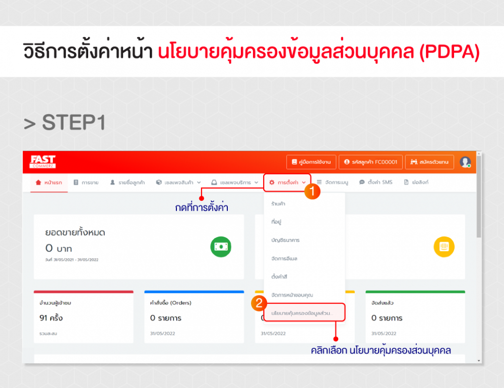 Step1 > เข้าหลังบ้าน Fastcommerz จากนั้น ไปที่เมนู “การตั้งค่า” จะมีแถบปรากฏออกมา จากนั้นเลือก อันล่างสุด แถบ “นโยบายคุ้มครองส่วนบุคคล”