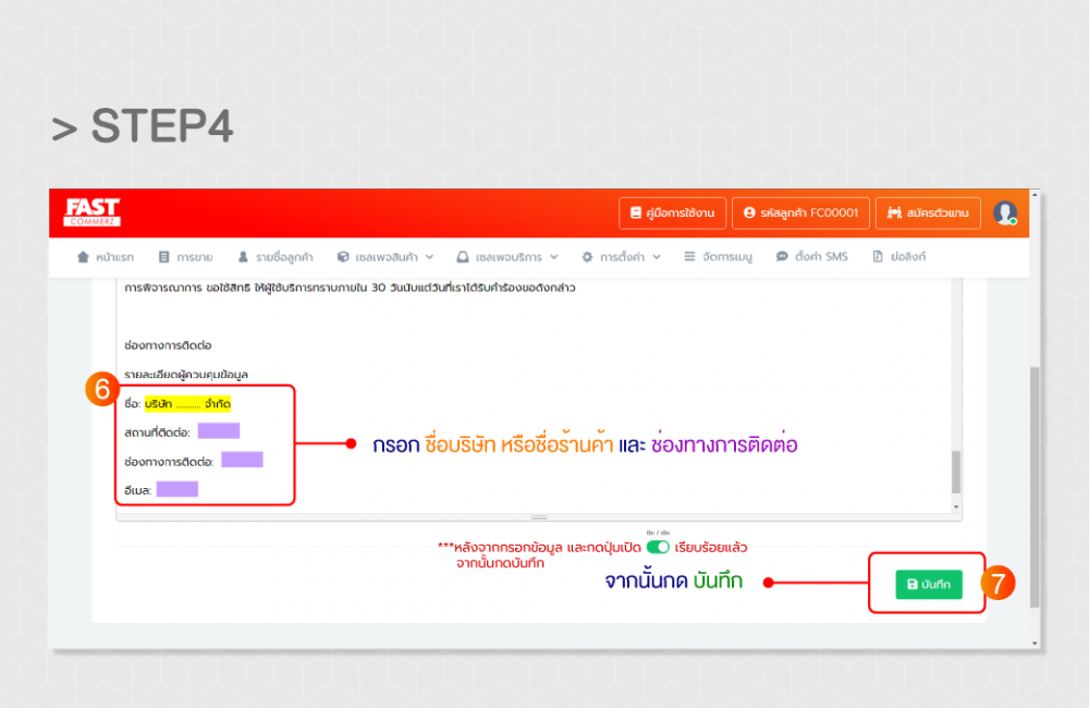 Step4 > ทำการกรอก “ชื่อบริษัท/ชื่อร้าน” และ “ช่องทางการติดต่อ”