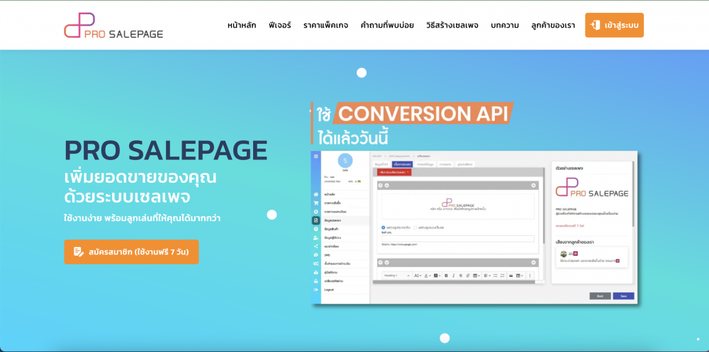 จบปัญหากับคำถามที่ว่า เลือกใช้ Sale Page เจ้าไหนดี ด้วย PRO SALEPAGE ที่ช่วยสร้างเซลเพจสำเร็จรูปได้หลายรูปแบบ ทั้งขายสินค้า, ลงทะเบียน หรือหน้าว่างสำหรับคนที่ต้องการออกแบบหน้าเซลเพจด้วยตัวเอง หากต้องการมี Domain Name เป็นชื่อของตนเองก็มีบริการสมัคร .COM ให้ได้ นอกจากนี้ยังรองรับ Facebook Pixel, Google Analytic รวมถึงแพลตฟอร์มใหม่มาแรงอย่างเช่น Tiktok Pixel สำหรับเก็บข้อมูลในการยิงแอดได้อีกด้วย